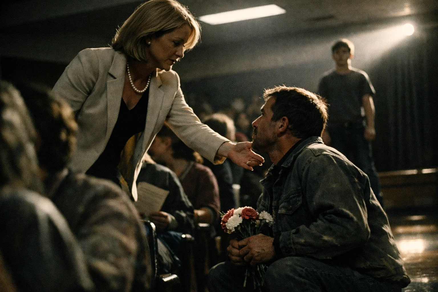 The sound of the door made her look up. For one second — just one — her face was completely open. Pure shock.