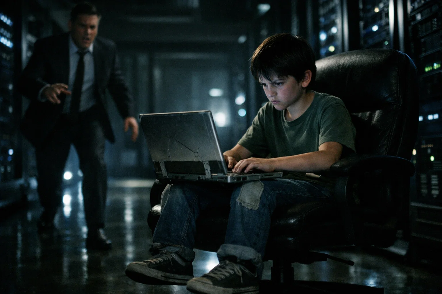 The secondary server room was cold and blue — rows of humming machines, blinking lights, the quiet desperation of a system trying to save itself. Adrian climbed onto the maintenance chair at the primary terminal. His sneakers dangled above the floor. He plugged in a custom cable he’d built from salvaged parts and connected the taped-up laptop.