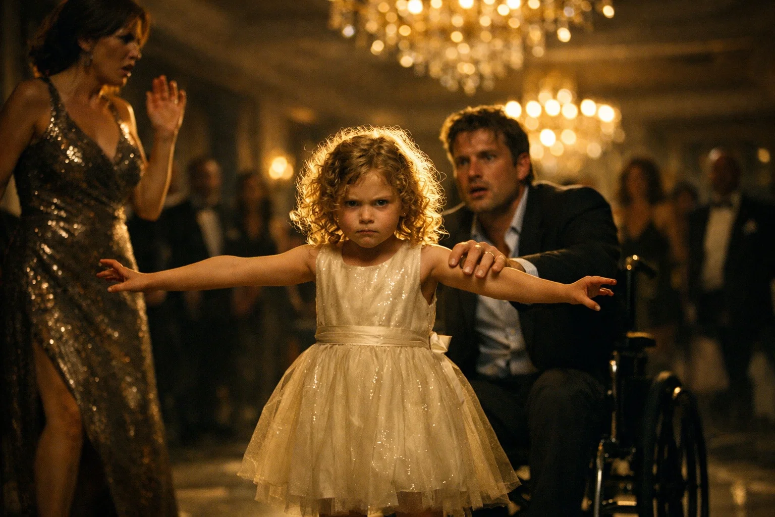 The ballroom glittered with crystal chandeliers and designer gowns. Nate arrived in his wheelchair with Isabella beside him and Sofia holding his hand.
